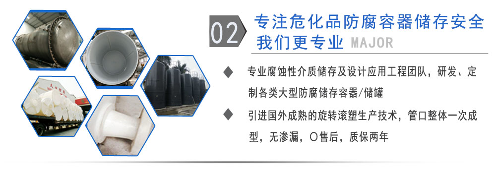 公司有鋼襯塑PE/PO、PE全塑、碳鋼、不銹鋼四大系列100多個品種,專注于常壓儲存容器生產,其產品包括鋼襯塑儲罐、管口一體成型PE儲罐、碳鋼儲罐、不銹鋼儲罐、反應釜、攪拌罐、離子交換柱、鋼襯PE/PO儲罐塑料儲罐、鹽酸儲罐、硫酸儲罐等等。更大限度滿足廣大客戶的各種需求,同時可以根據客戶的需要加工定制各種防腐設備。